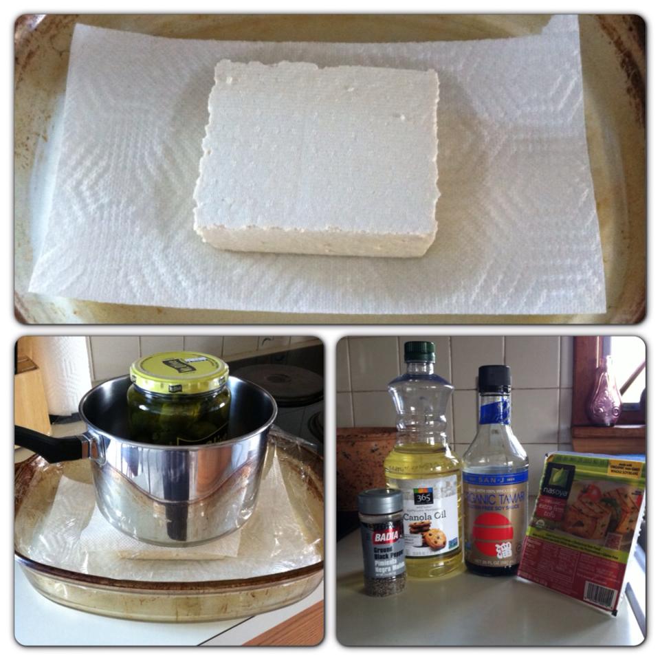 Start by pressing some of the water out of your block of tofu. In a large dish place a couple of paper towels inside and set the tofu on top. Place another paper towel on top of the tofu and then top that with a piece of plastic wrap. Top that with a sauce pan with a can or jar of anything in your cupboard. This gives it some weight to help press the tofu. Let it stand for at least 15 minutes. You will be surprised how much water comes out!